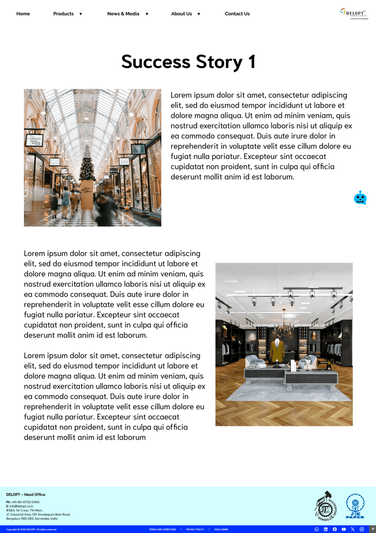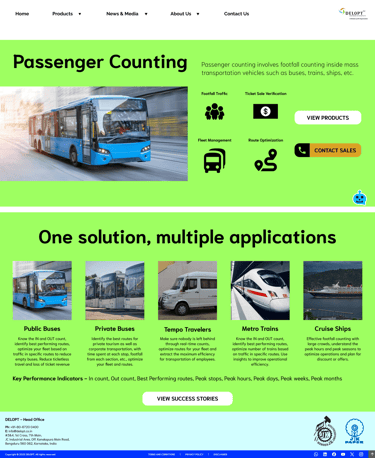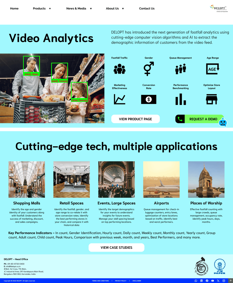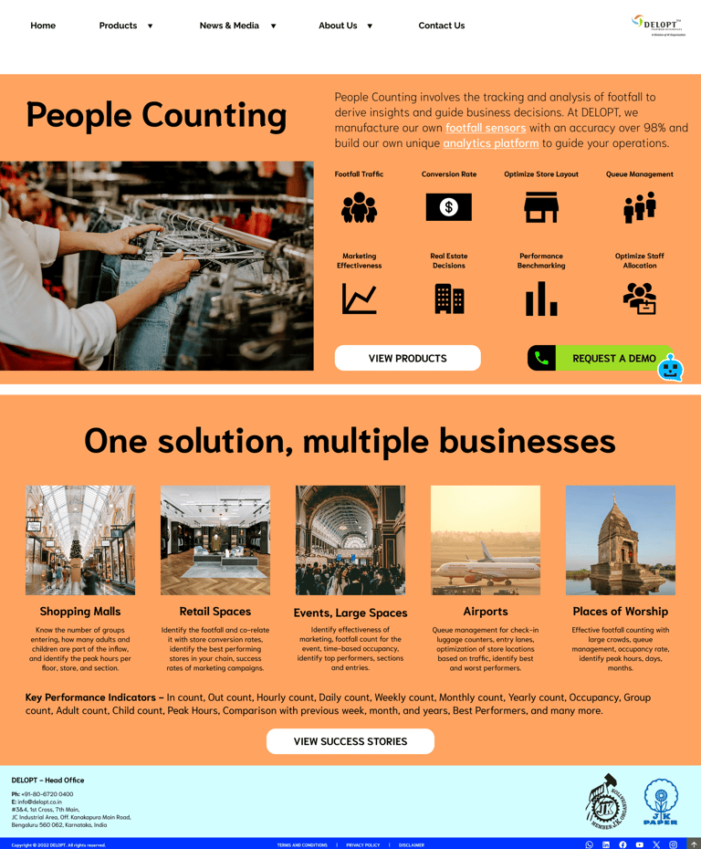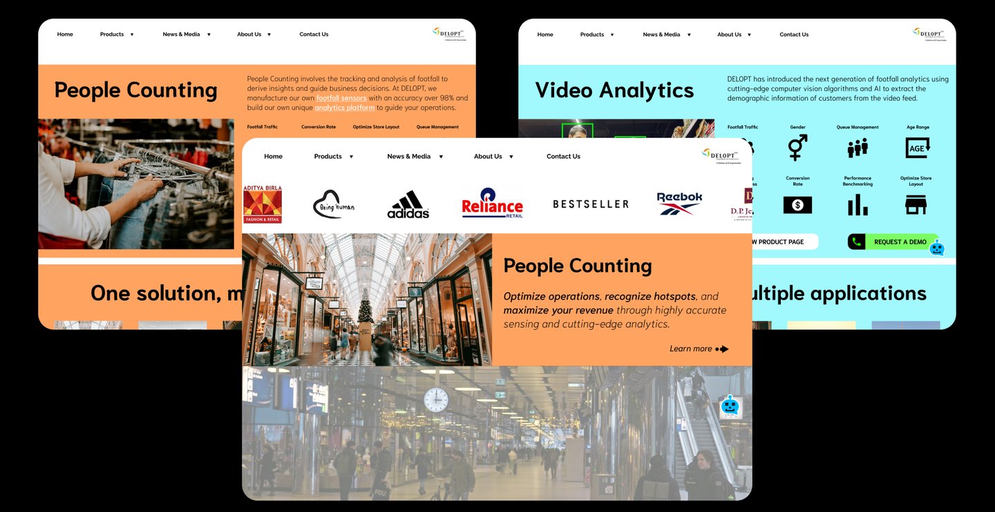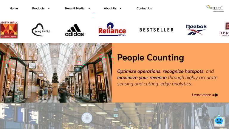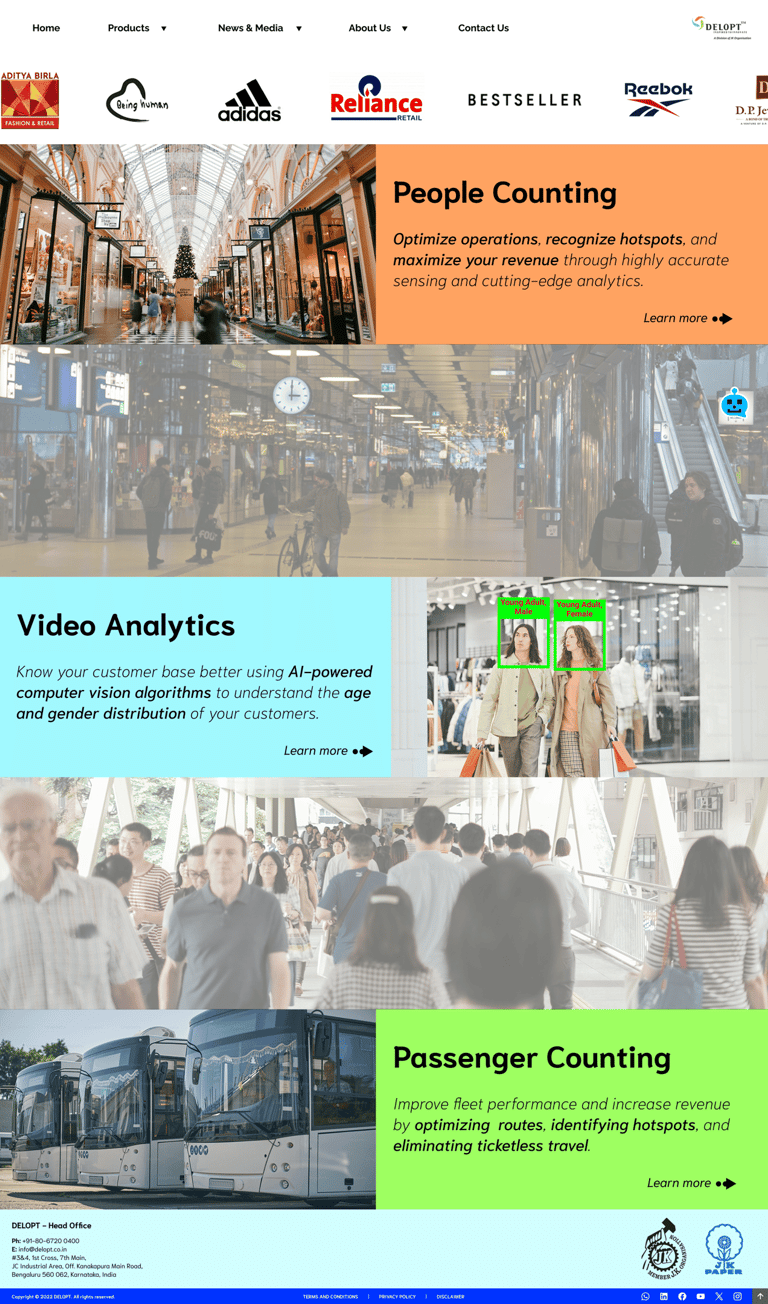 DELOPT is a retail and defense tech company owned by JK Paper, a part of the JK Group conglomeration. The retail division of DELOPT focuses on monitoring the footfall in retail stores and malls, to help management identify visitor patterns and plan their business accordingly. The current website includes both the defense and the retail divisions but mostly displays the defense division, with a single page for the retail division. The content for the division is mostly outdated text with a couple of images and one promotional video.