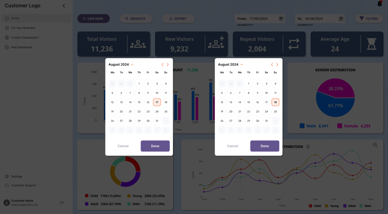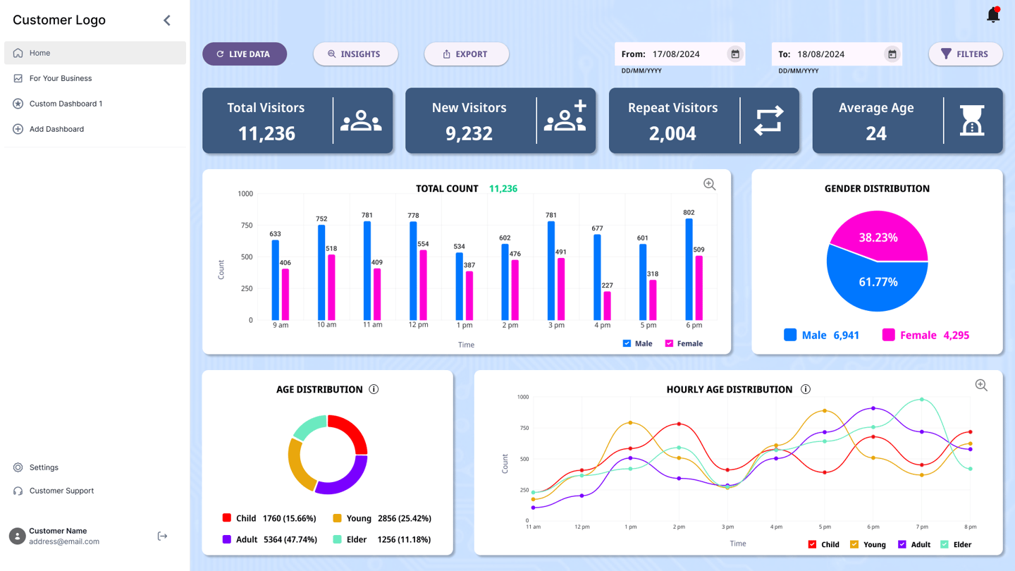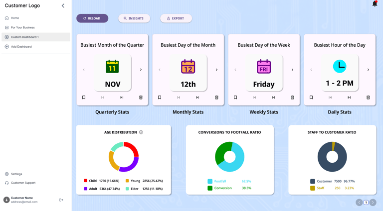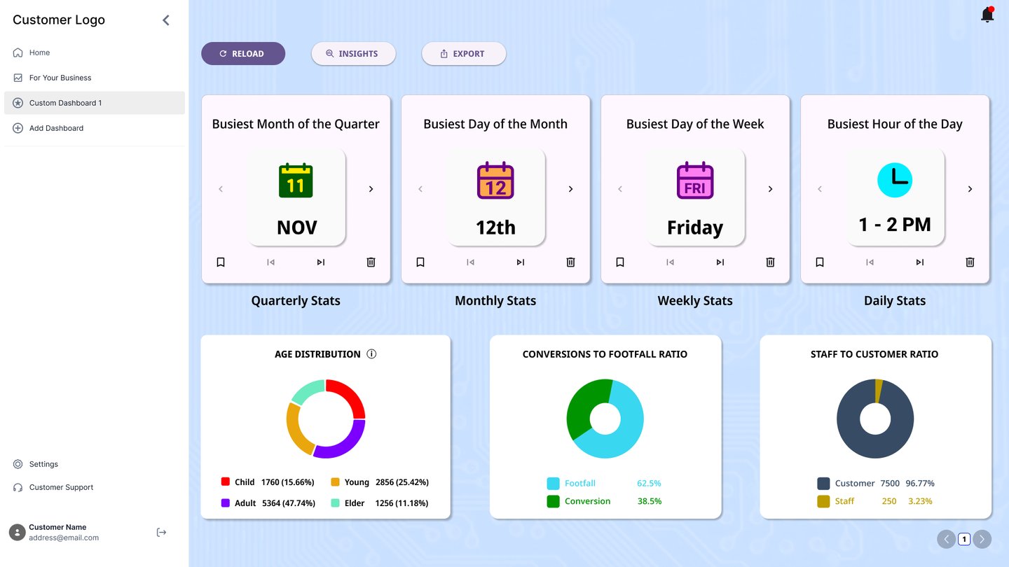 The current DELOPT Retail Analytics platform only displays graphs and footfall count data. The user is forced to interpret the graphs and data to derive business insights. The platform also lacks a uniform color palette and typography, leading to poor readability and experience. There is also a lack of summary and analysis of data in the reports as well as the dashboard.