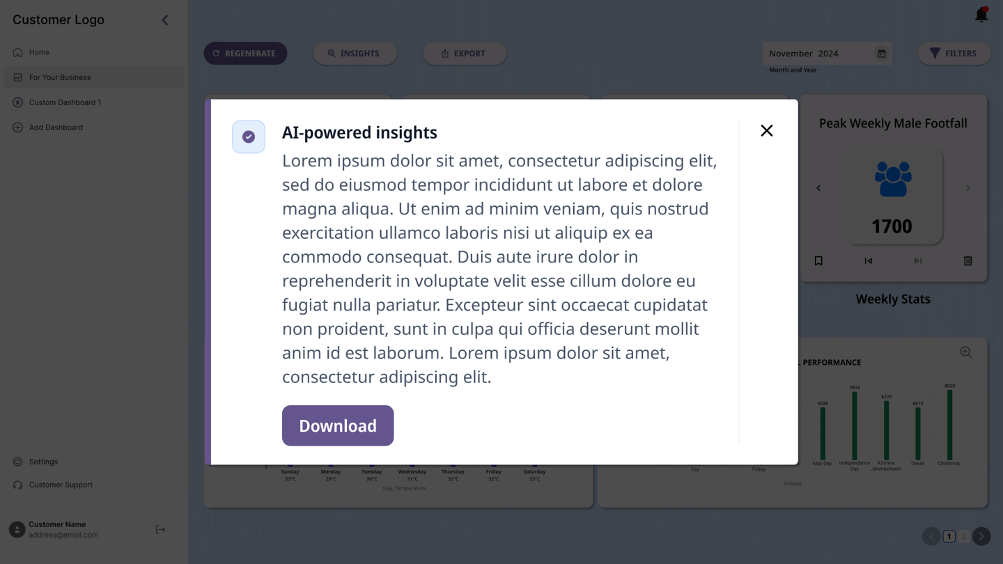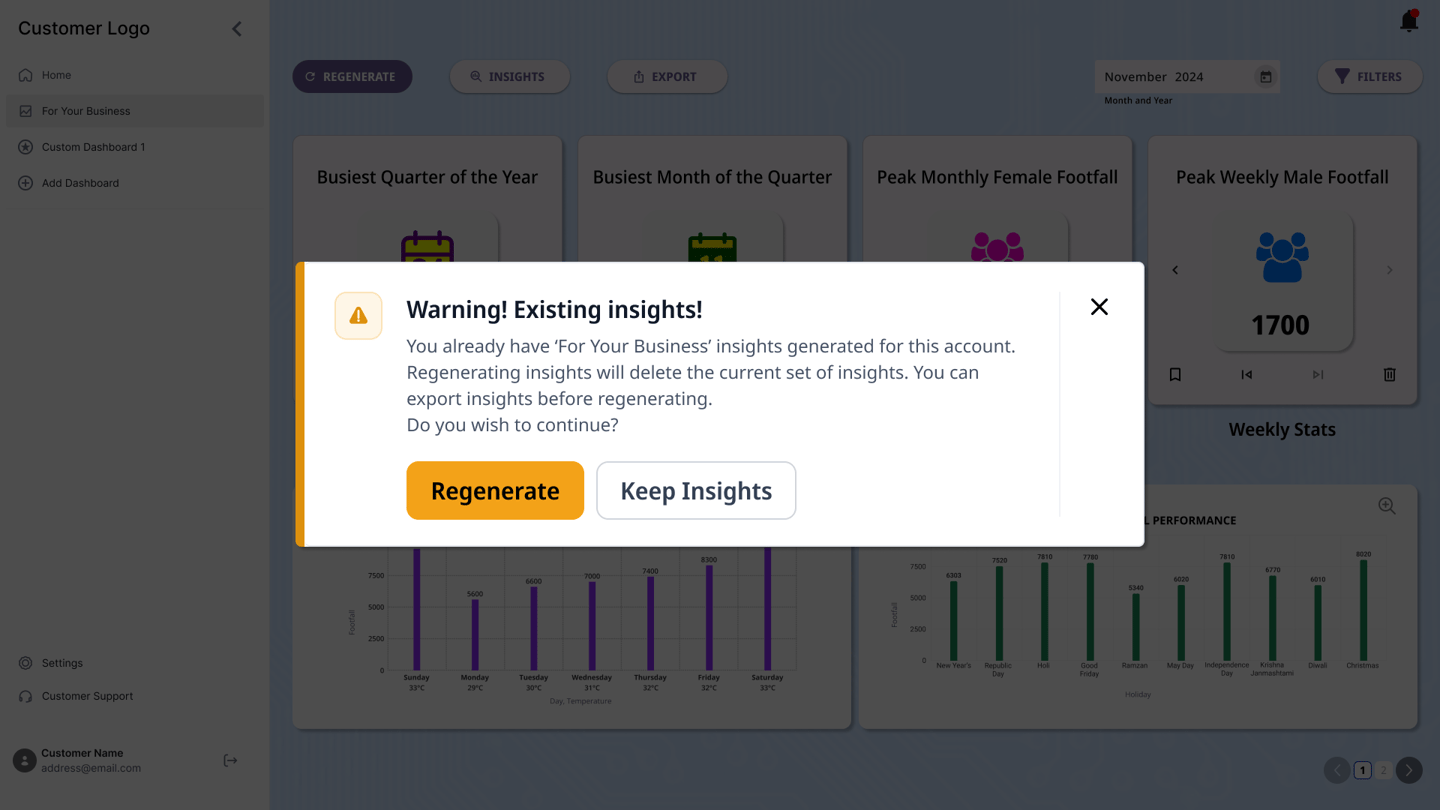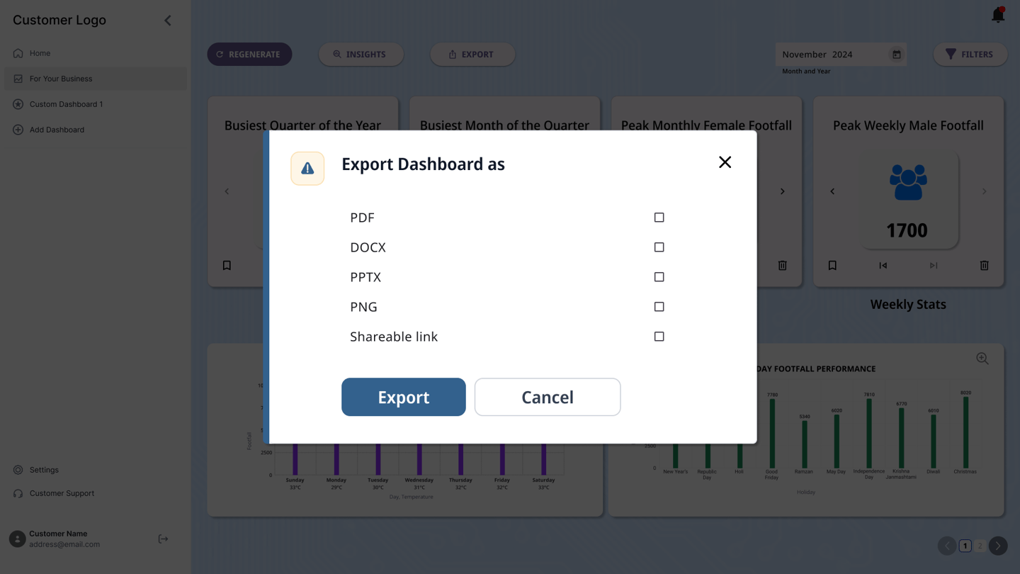 Additional options such as exporting the dashboards to a viewable link or a downloadable file were also included. Users were also provided an option to regenerate insights while saving the previously generated insights as a backup. The users were also provided an option to download the insights for sharing.