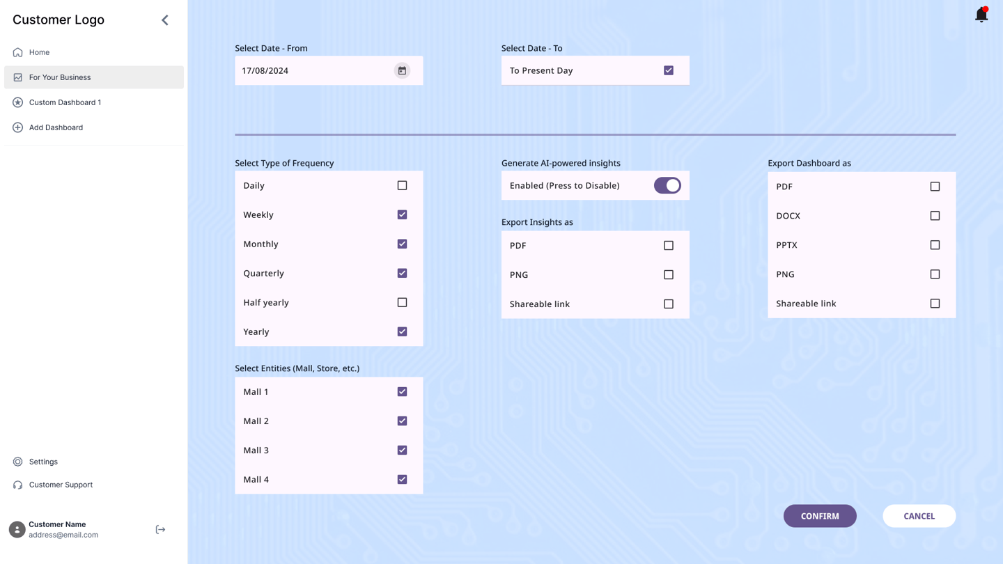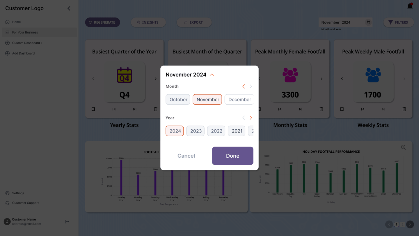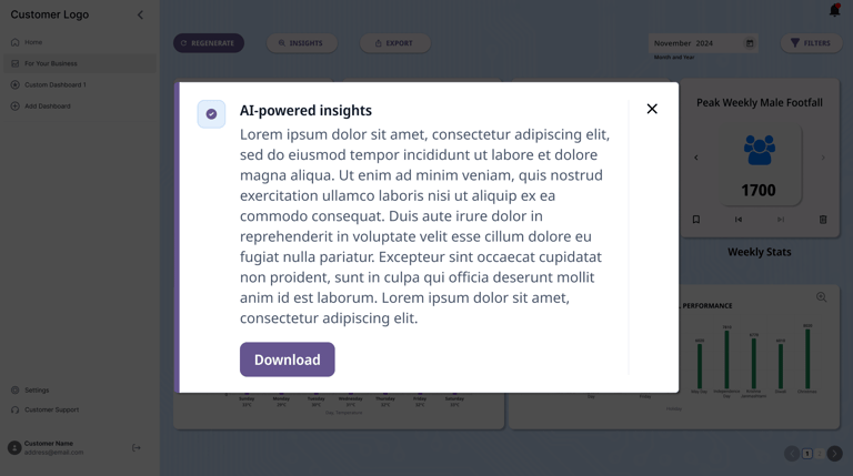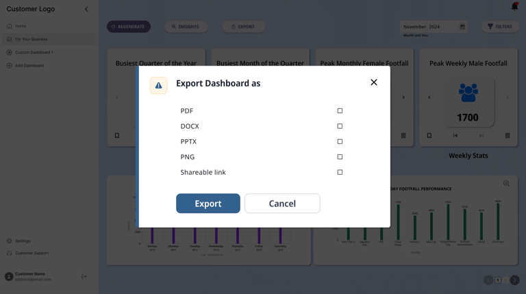 Additional options such as exporting the dashboards to a viewable link or a downloadable file were also included. Users were also provided an option to regenerate insights while saving the previously generated insights as a backup. The users were also provided an option to download the insights for sharing.